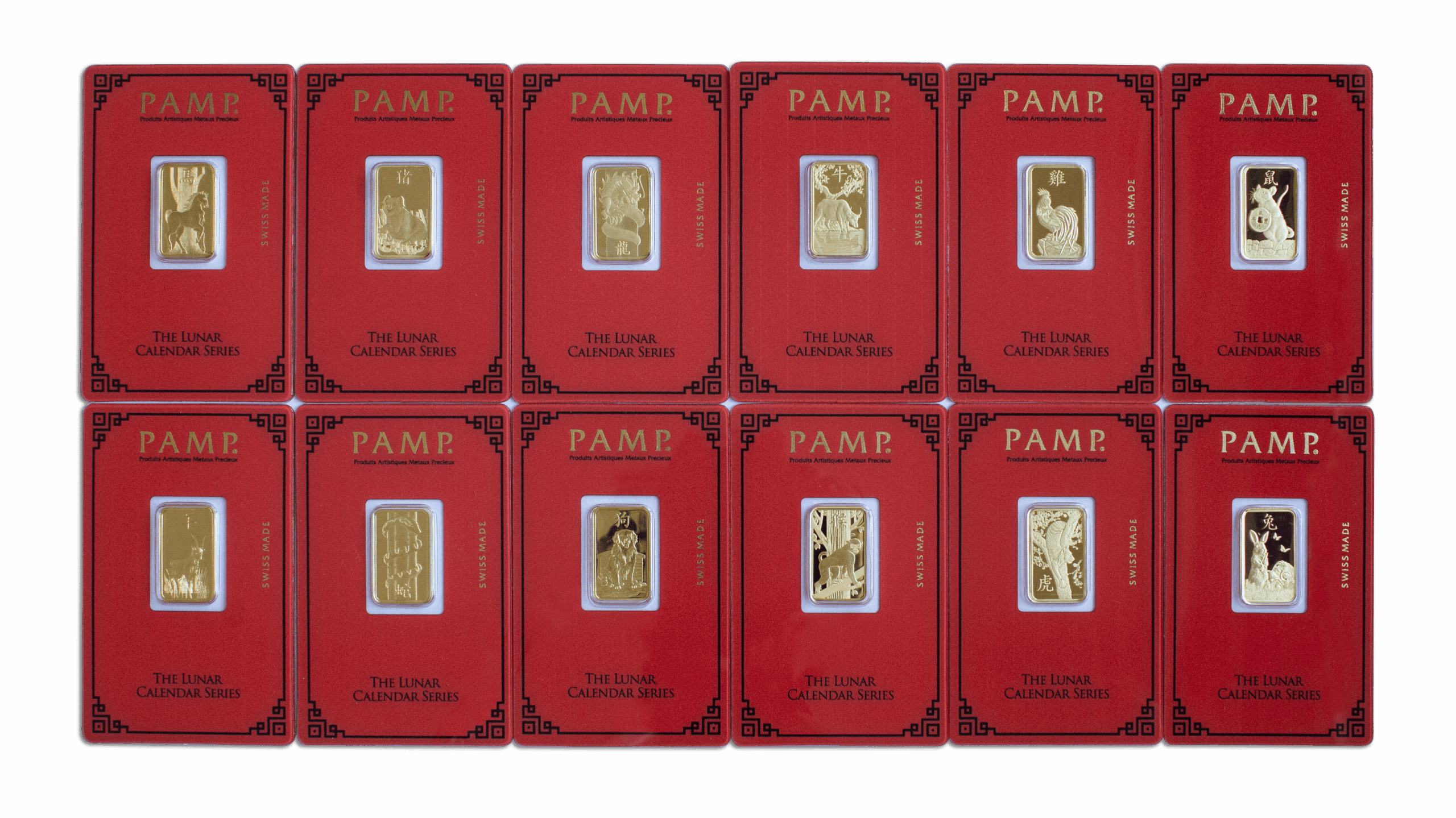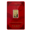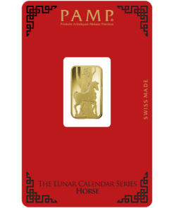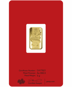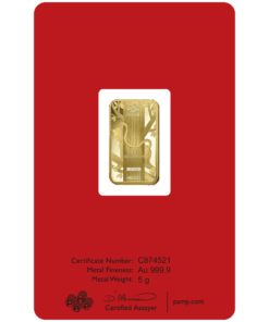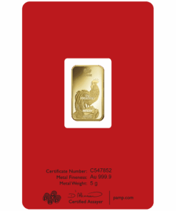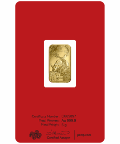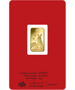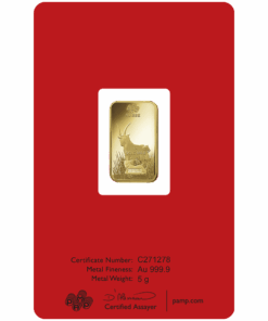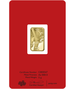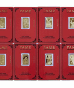 Descripition: Introducing the exquisite PAMP Lunar Series 5g Gold Bar Set, celebrate wealth and prosperity with the full Lunar Series Bars. Crafted by PAMP Suisse, a world-renowned name in recious metals, this limited edition gold bar is a testament to precision, quality, and artistic brilliance. Each bar’s obverse side features a distinct image of each year’s Lunar Animal. The intricate design captures the essence of the animal’s spirit with a stunning combination of fine lines and delicate shading, a testament to the unparalleled craftsmanship of PAMP. On the reverse side, the bar showcases the iconic PAMP Suisse logo along with essential information such as weight (5 grams), purity (99.99% pure gold), and the unique serial number. The reverse design is a testament to the bar’s authenticity and adherence to the highest industry standards. Each set includes the Year of Dragon, Snake, Horse, Goat, Monkey, Rooster, Dog, Pig, Rat, Ox, Tiger, and Rabbit 5g gold bars.