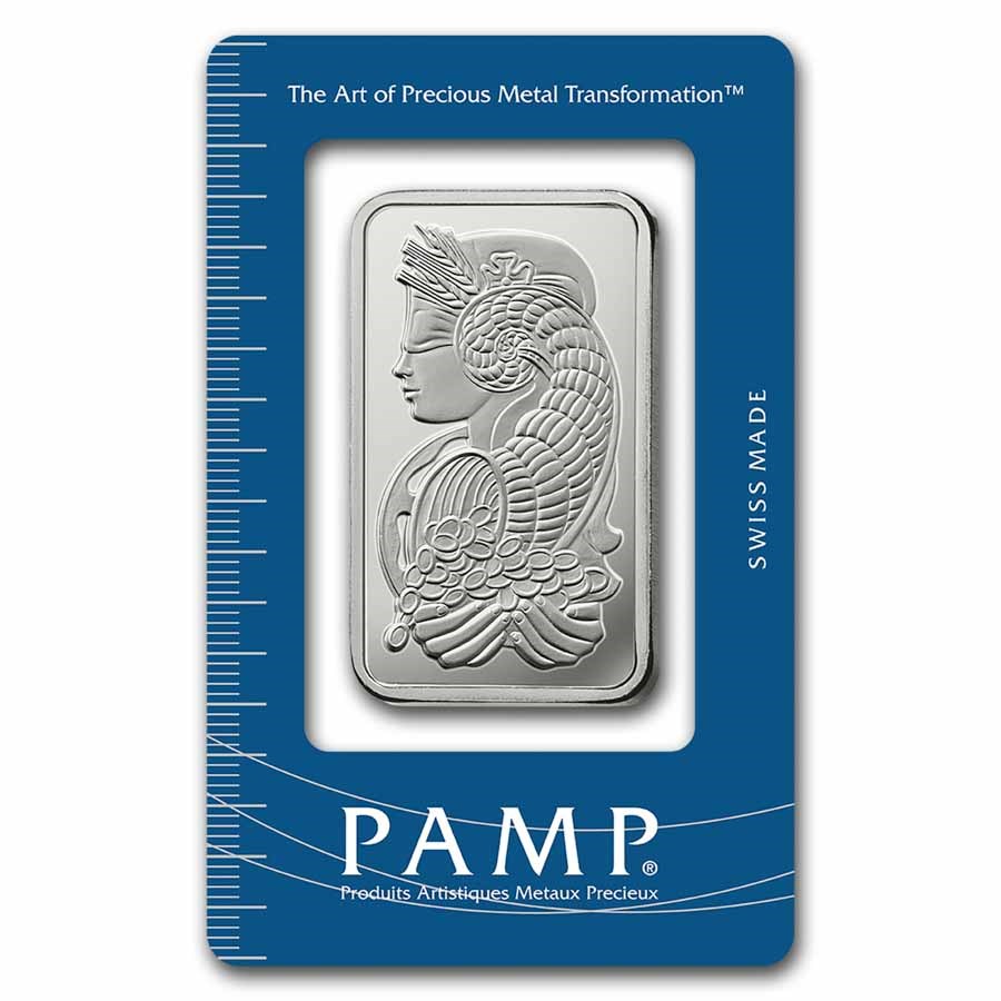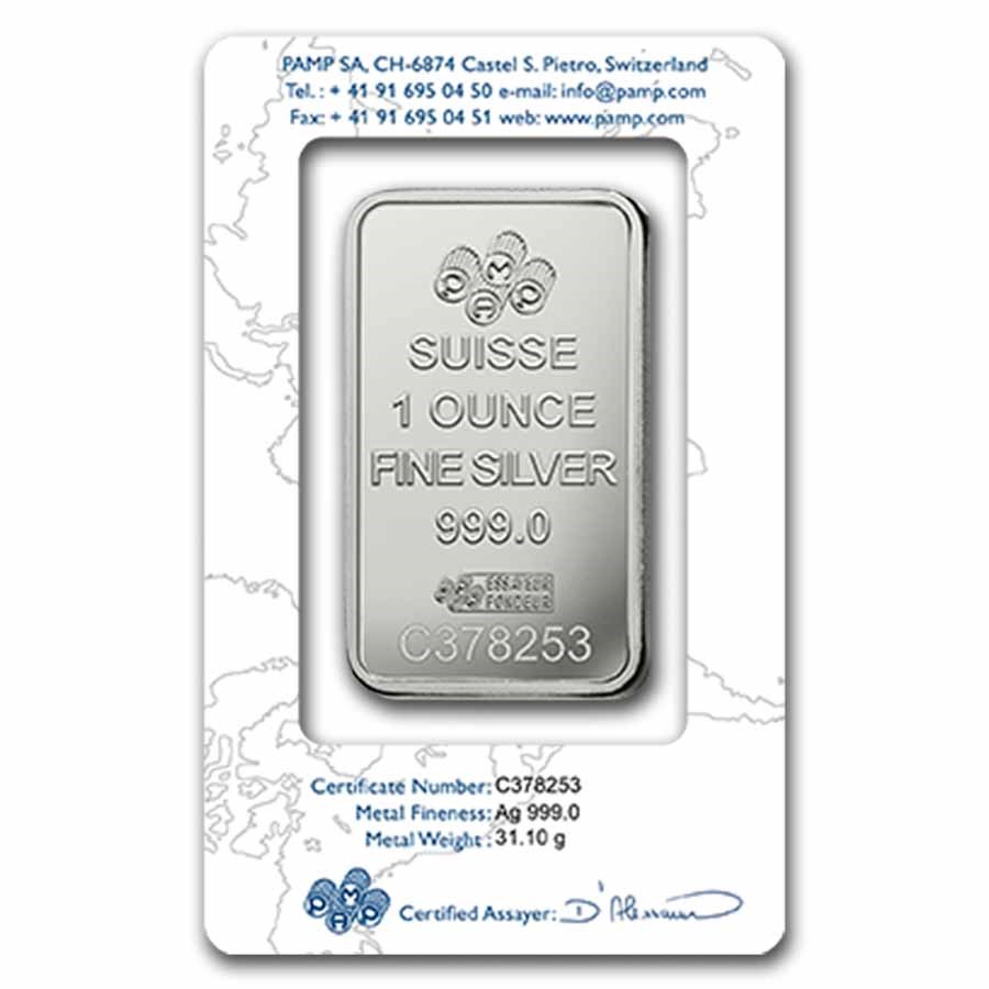 In 1979, PAMP became the first precious metals brand to adorn the reverse sides of its minted bars. The 1 oz Pamp Suisse Fortuna Silver Bar has since gained worldwide recognition as a symbol of PAMP’s commitment to quality and authenticity. The bar features a proof-like finish and depicts the Roman goddess of prosperity with various mythical attributes, including sheaves of wheat, poppies, a horn of plenty, precious coins, and a wheel of fortune. The Lady Fortuna™ image is widely regarded as the most prestigious and recognizable bullion bar design in existence. Each 1 oz Pamp Suisse Fortuna Silver Bar is accredited by the Swiss Federal Bureau, registered individually, and sealed in CertiPAMP™ packaging for protection. The packaging includes an official Assay Certificate that guarantees the bar’s fine, precious metal content and weight. The certificate is protected by a removable film.
